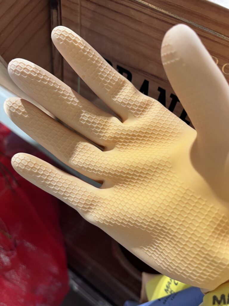 先日ショップでマリーゴールド手袋のイエロー(キッチン用)『油に強く、滑りにくい仕様』を試すことができました。