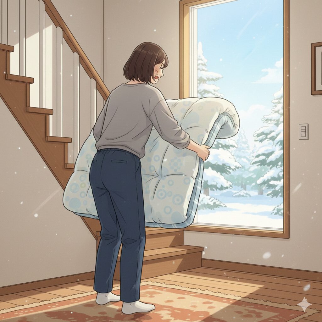 重いマットレスや布団を運ぶのは正直かなりの重労働で、どうしても日々の外干しはハードルが高くなりがち。基本は室内干しがメインです。