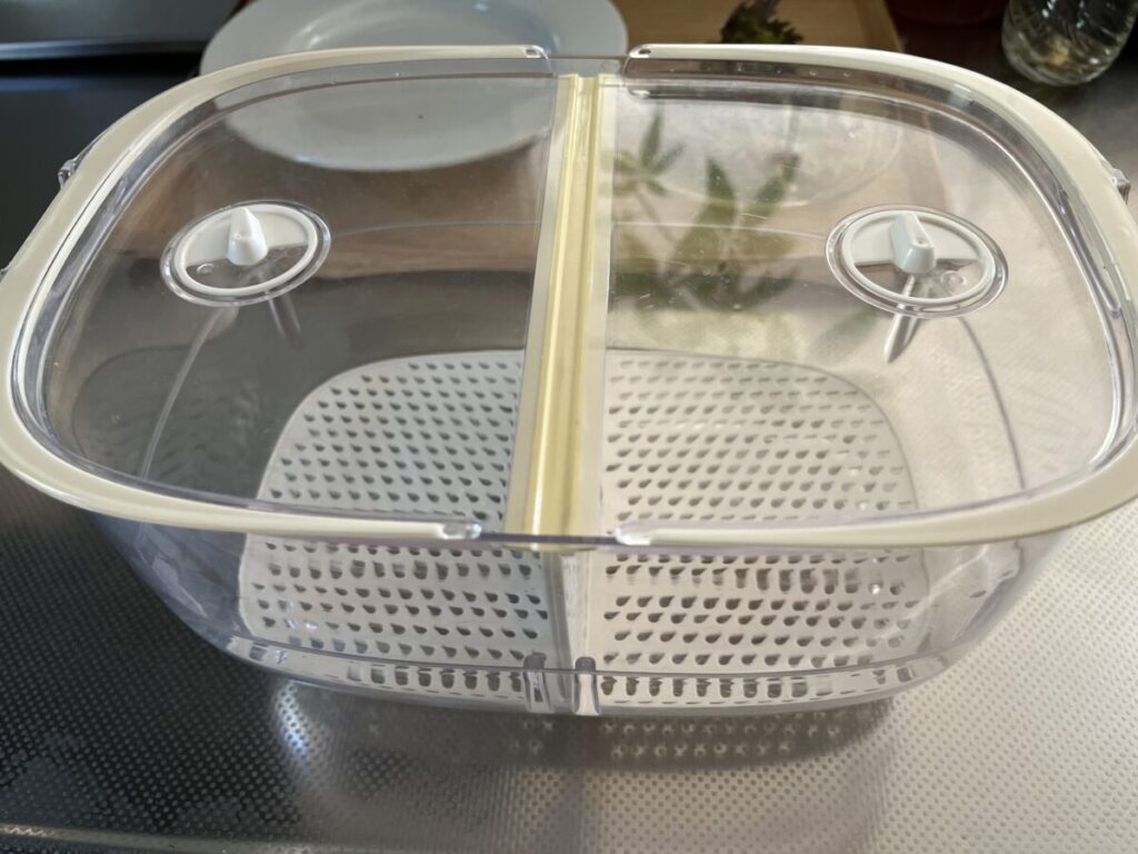 洗ってから**ニトリの「フレッシュキーパー」**に入れて冷蔵庫へ。