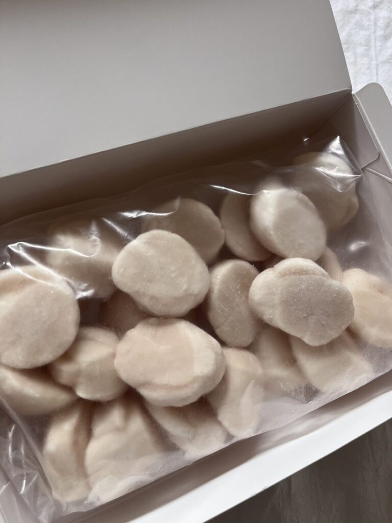 別海町から冷凍で届く刺身用ホタテで、解凍するだけで食べられます。